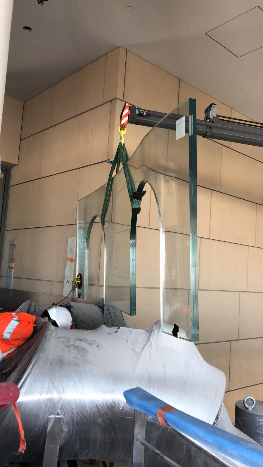 Livraison et déchargement dans nos locaux d’un vitrage double courbure d’un poids total de 400kgs.