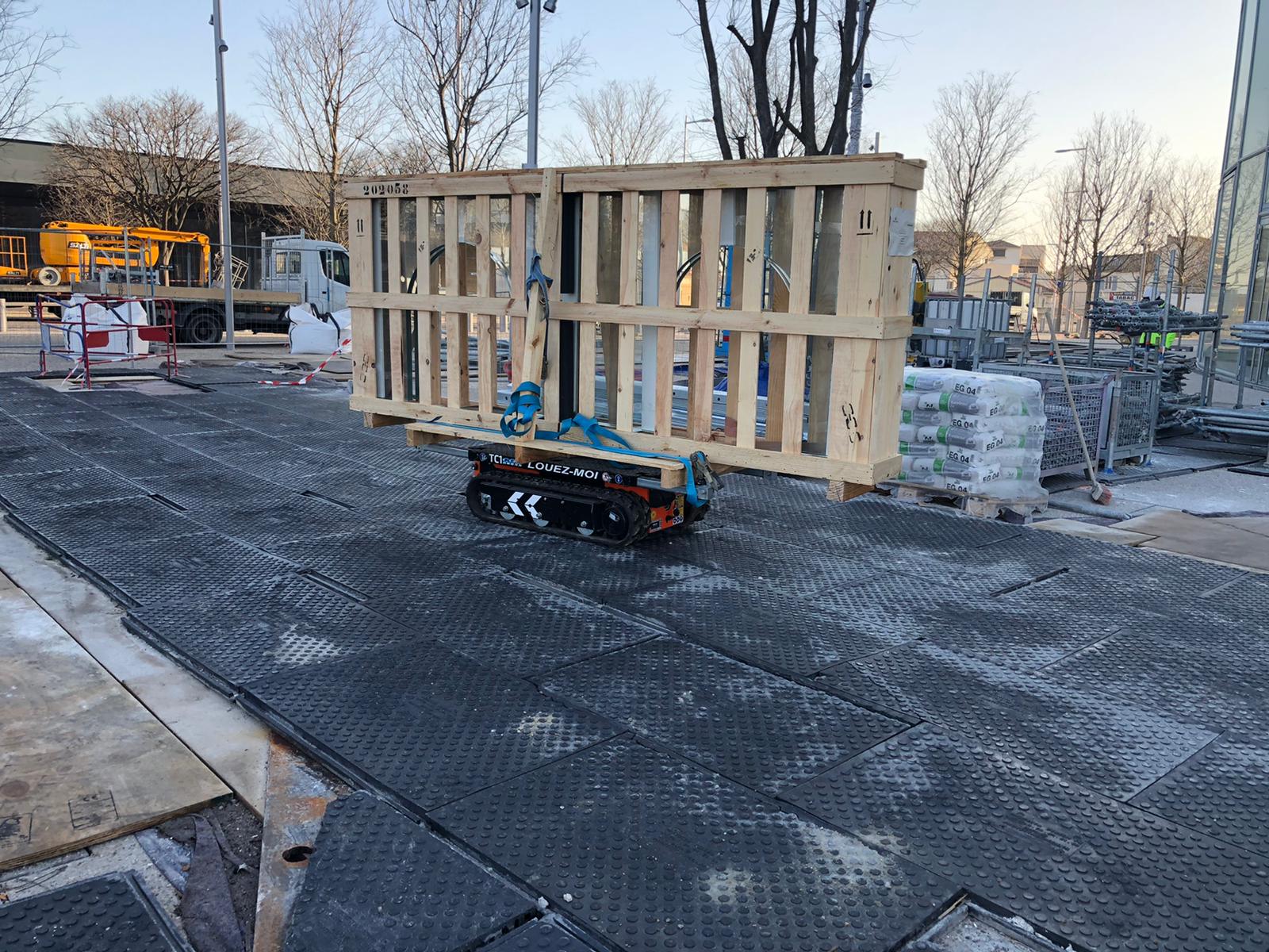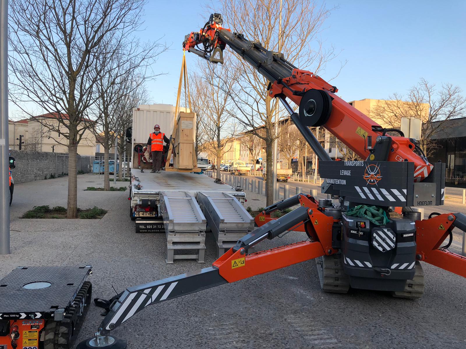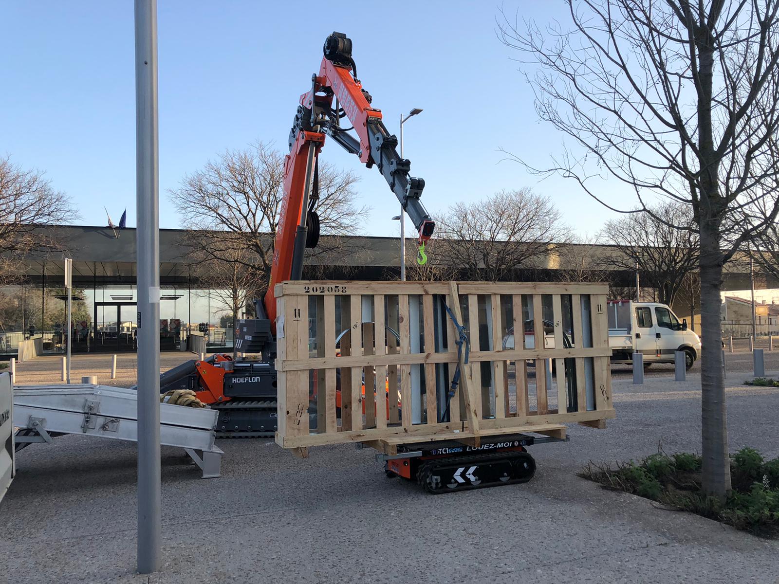 Transport et mise en place à l’aide de notre transporteur TC1 d’une capacité de 1200kg ainsi que notre mini grue C30e entièrement électrique !